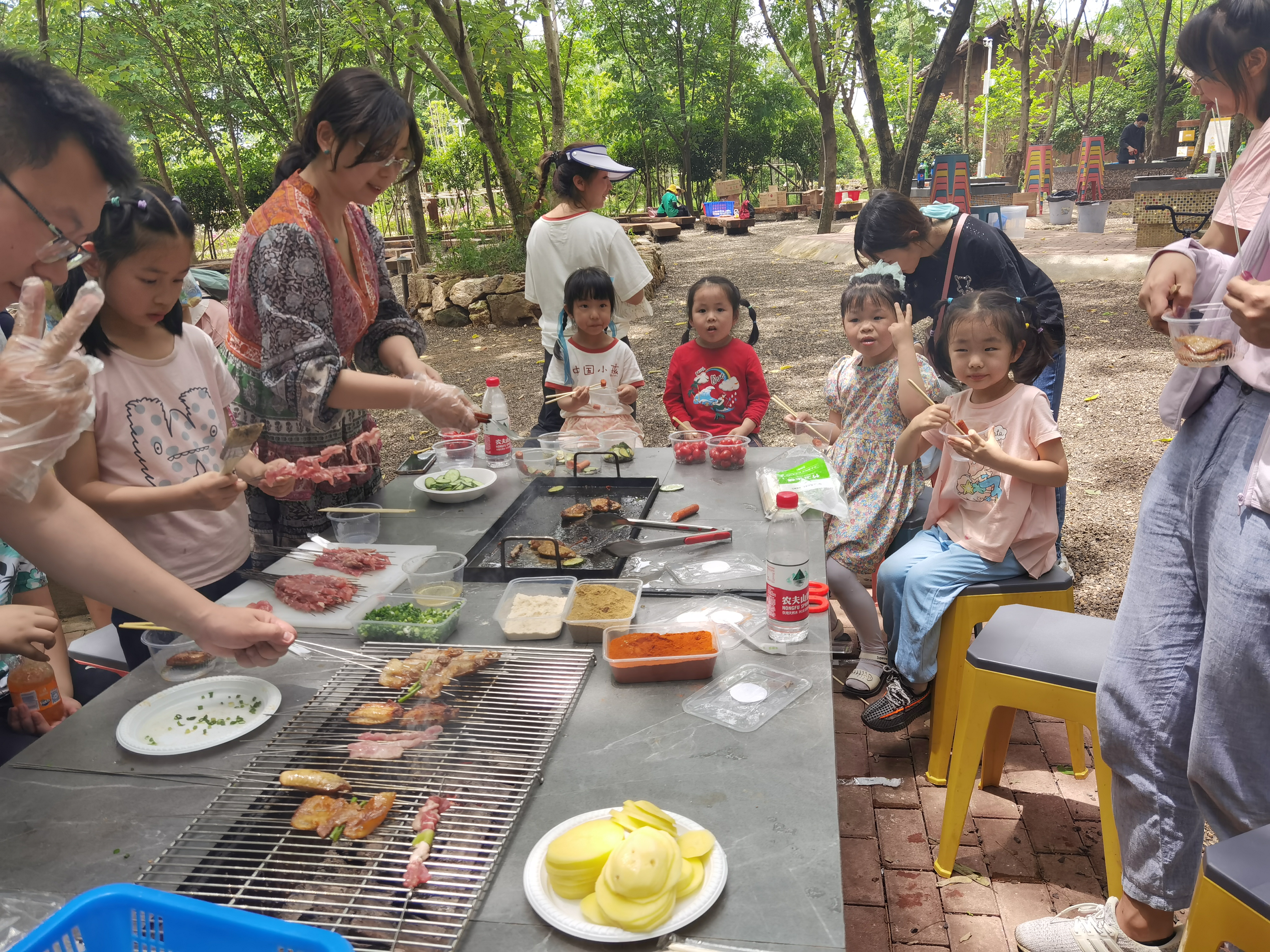 半天行程过后,在孩子们充满快乐和期盼的眼神中,烧烤活动正式开始。在家长们的帮助下,孩子们配合默契,一个个化身成“劳动小能手”,架炉子、涮调料、摆桌子、串食材,一时间热火朝天,大家忙得不亦乐乎却有条不紊。大小朋友们围坐在一起,吃着烤串,闲话家常,开怀大笑,各种美味香气萦绕在空气中,场面热闹而欢快!