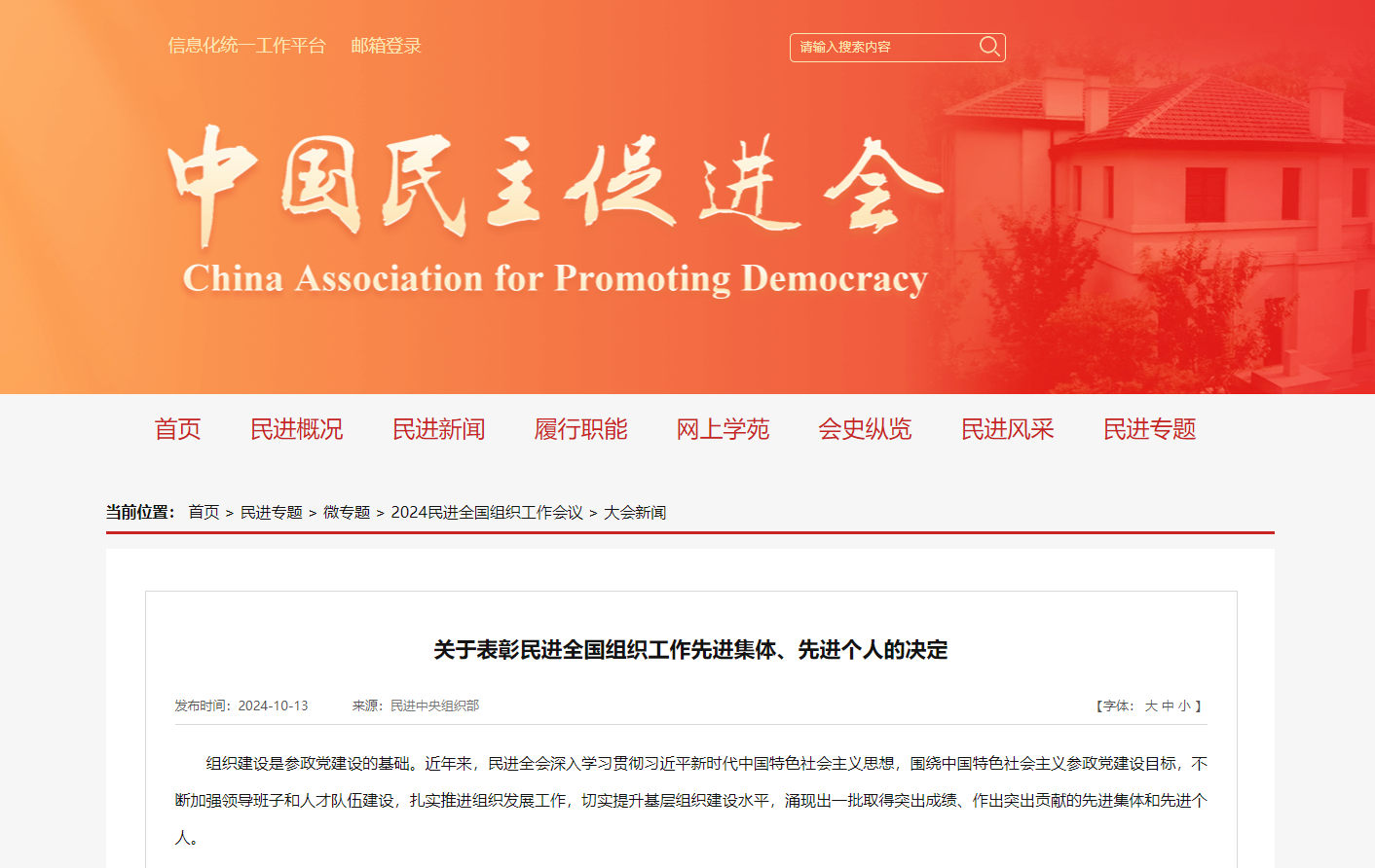 2024年10月13日,民进全国组织工作会议在北京召开。民进中央主席蔡达峰出席开幕式并讲话,常务副主席朱永新,副主席王刚、高友东、何志敏出席开幕会。会议现场宣读了《关于表彰民进全国组织工作先进集体、先进个人的决定》,并为受表彰的先进集体和先进个人代表颁奖。永业行副总裁、民进湖北永业行支部主委金建华荣获“民进全国组织工作先进个人”荣誉称号。